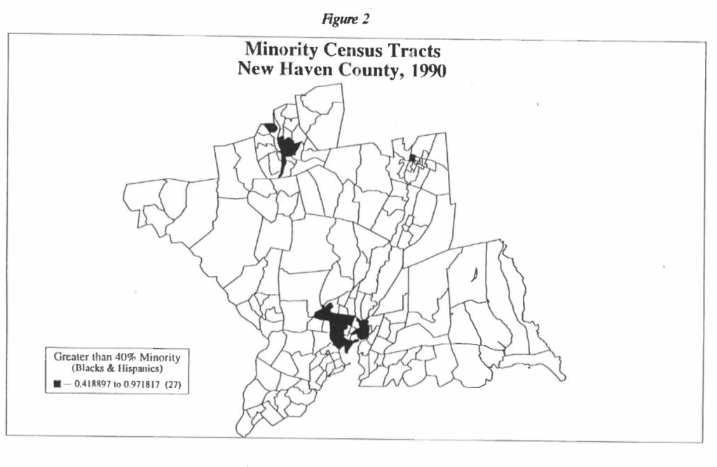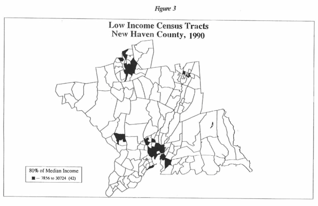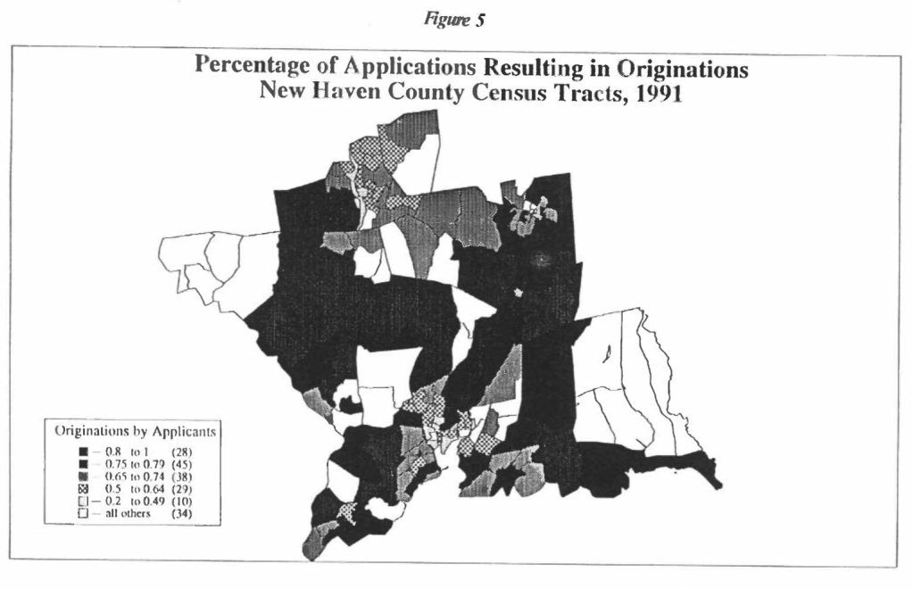 Applications received from low-income census tracts (defined as census tracts with median incomes below 80% of the median income in New Haven County) and minority census tracts (defined as census tracts with a combined percentage of black and Hispanic residents above 40%) were also less likely to result in loan originations. In 1990, 71.0% of the applications received from minority census tracts (non-minority tracts achieved 77.4%) and 74.9% of the applications received from low-income census tracts resulted in loan originations (non-low income tracts were 77.2% ). In 1991 with a greater volume of applications the aggregate numbers were even less favorable to minority and low income census tracts. 58.1% of the applications received from minority census tracts and 65.0% of the applications received from low-income census tracts resulted in loan originations (as opposed to the fairly constant figures of 77.2% for non-minority tracts and 77.4% for non-low-income tracts).